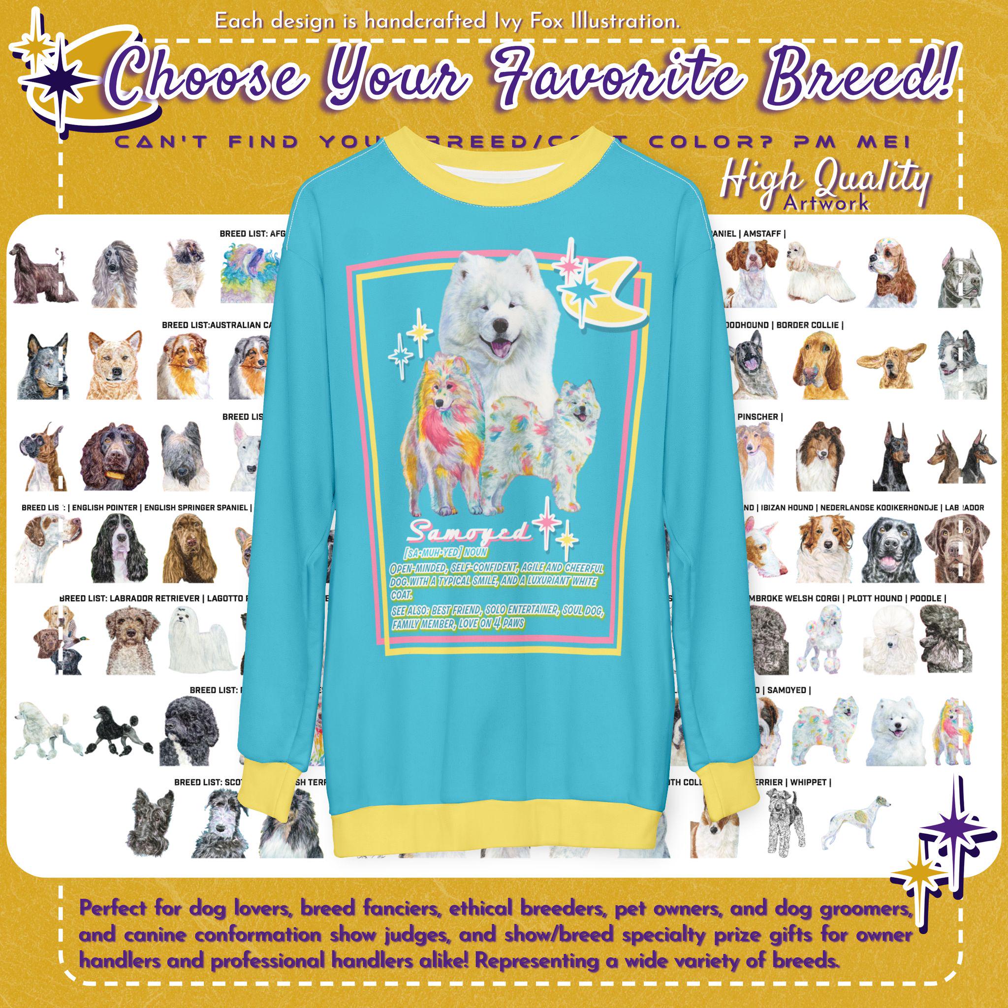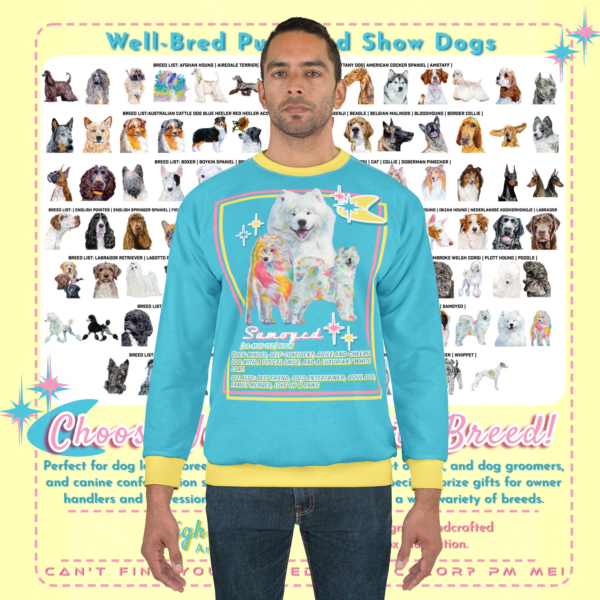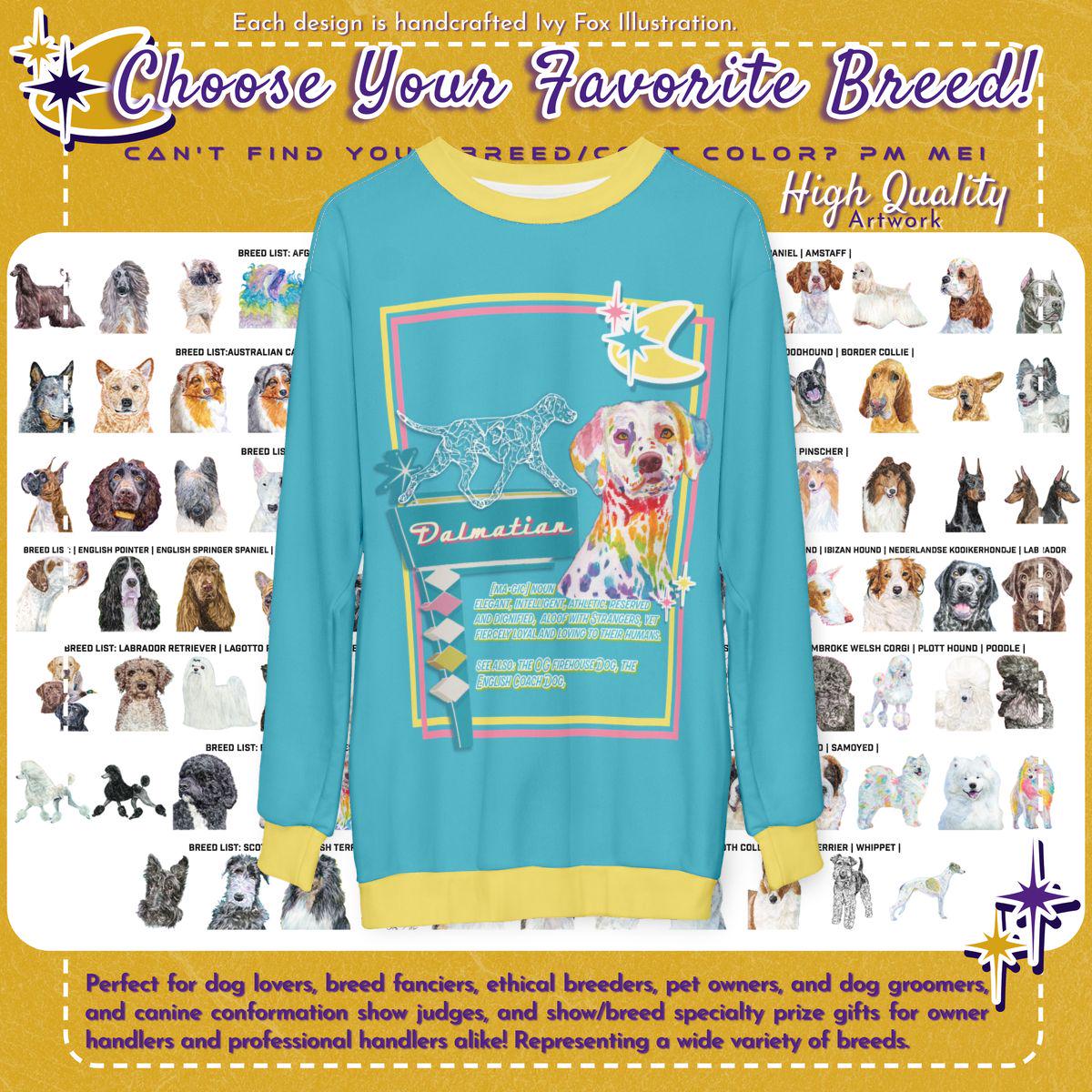 Colorful Retro futurism Dog Breed Sweatshirt with a space age art design featuring mid century modern starburst boomerang. Perfect for dog lovers looking for unique gifts. Adds a vibrant and stylish vibe to any outfit, suitable for casual wear or as a statement piece. Ideal for holidays, birthdays, and special occasions. This is the perfect accessory for dog lovers, breed fanciers, ethical breeders, pet owners, and dog groomers, and canine conformation show judges, and would be useful show/breed specialty prize gift for owner handlers and professional handlers alike! It is suitable for birthdays, holidays, dog shows, and dog sporting events. Perfect for the dog person who has everything.
